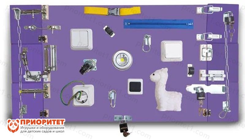 На панели можно увидеть застежку-молнию, цепочки, защелки, скрепки. Все это помогает малышу познакомиться с устройством сложной техники и приборов на детальном уровне. Предметы можно вращать, защелкивать, рассматривать. Ребенок может поиграть с предметами в условиях сюжетной игры или на занятии с педагогом. Предмет не требует особых условий хранения.