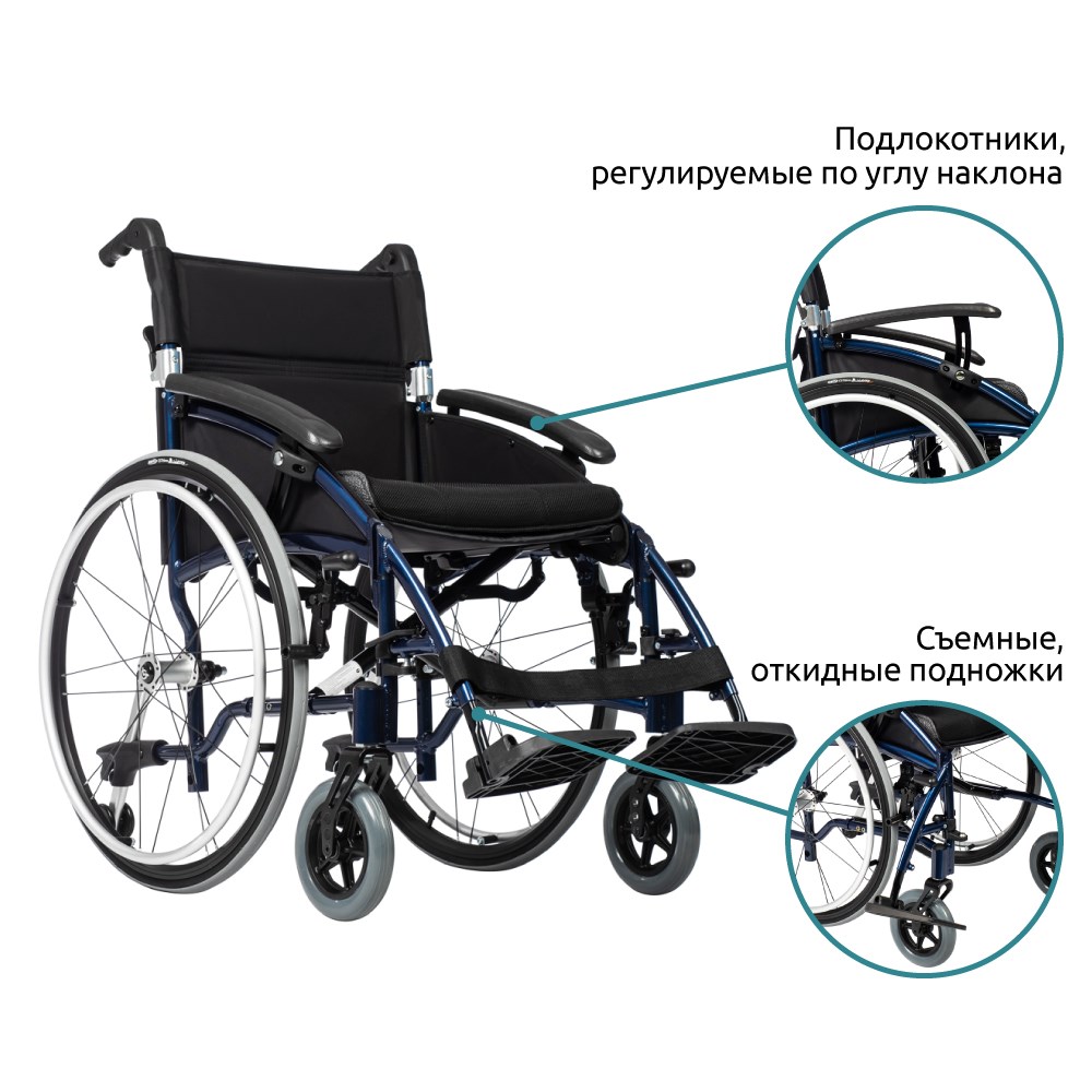 Дополнительные характеристикиБыстросъемные задние колеса, Карман с внутренней стороны бокового щитка, Колесные антиопрокидыватели с упором для сопровождающего лица, Откидные опоры для стоп, Пневматические задние колеса, Подлокотники, регулируемые по углу наклона, Складная спинка, Складные ручки для сопровождающего лица, Съемные, откидные подножки