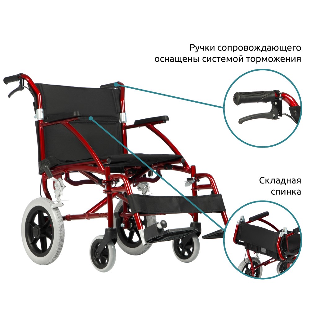 Дополнительные характеристикиЗадние колеса увеличенного диаметра, Карман под сиденьем, Откидные опоры для стоп, Откидные подножки, регулируемые по длине, Ремень для голени, Ручки для сопровождающего лица, оснащенные системой торможения, Ручные стояночные тормоза, Складная спинка, Упоры для сопровождающего лица