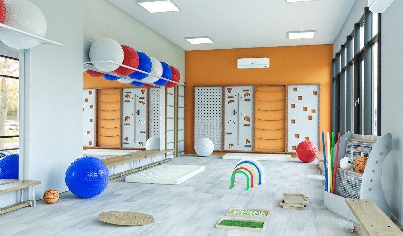 Комплект оборудования для зала лечебной физкультуры представляет собой готовое решение, включающее удобную и функциональную мебель, развивающий стенд для занятий скалолазанием, а также стеллаж для удобного хранения спортивного инвентаря.