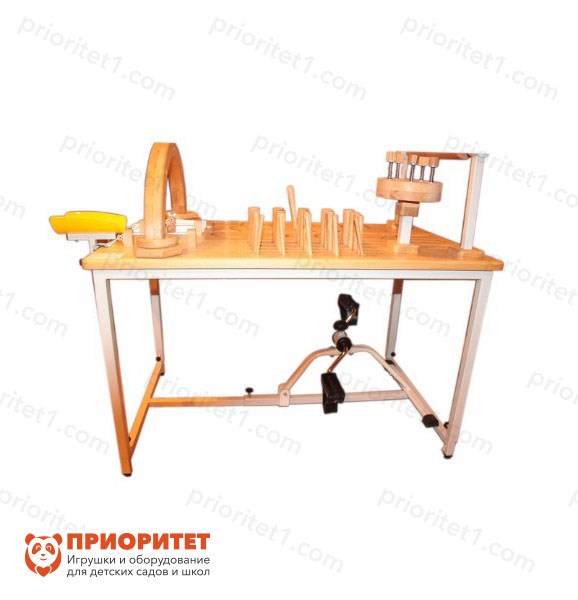 Стол имеет сертификацию по всем требованиям ФГОС, регистрационное удостоверение медицинского изделия. Изготовлен тренажер из дерева высшего сорта, которое обладает высокой прочностью и надежностью. Гладкий, тщательно отшлифованный материал без зазубрин дает возможность заниматься без получения заноз. Также, отсутствуют острые углы и элементы, что позволяет использовать развивающий комплекс без травмирования. Стол может подстроится под рост ребенка, так как имеет специальный механизм. С его помощью можно выдвинуть ножки и закрепить их.