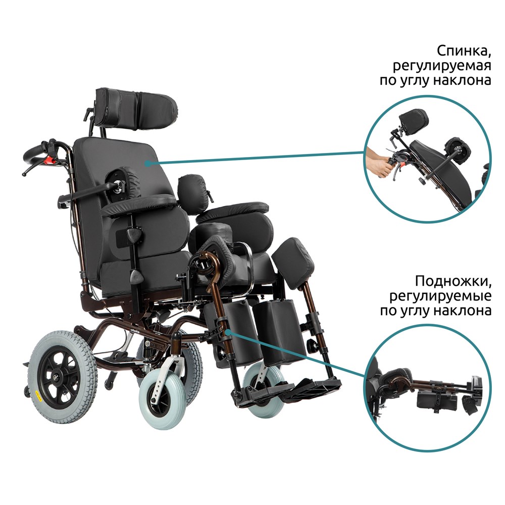 Дополнительные характеристикиЖесткое основание сиденья, Жесткое основание спинки, Мягкие боковые опоры для коленей, Откидные подножки, Подножки, регулируемые по углу наклона, Ручки для сопровождающего лица, регулируемые по высоте, оснащены системой торможения, Сиденье вместе со спинкой, плавно регулируемые по углу наклона при помощи рычагов на ручках для сопровождающего лица, Спинка, регулируемая по углу наклона при помощи рычагов на ручках для сопровождающего лица, Съемные колесные антиопрокидыватели с упором для сопровождающего лица, регулируемые по высоте, Съемные подлокотники, Съемный абдуктор, регулируемый по глубине, Съемный подголовник, регулируемый по высоте, углу наклона и охвату головы
