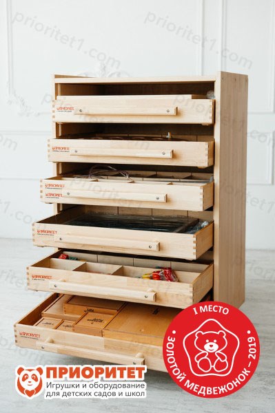 В деревянном ящичке с удобными отсеками разместили 14 комплектов дидактических игрушек, изготовленных из дерева. Они сделаны в точном соответствии с методикой Марии Монтессори. Занятия направлены, в первую очередь, на логическое мышление, счет, умение сравнивать и классифицировать. Параллельно развивается моторика пальцев, координация движений, фантазия, усидчивость. Ребенок запоминает названия цветов, фигур.