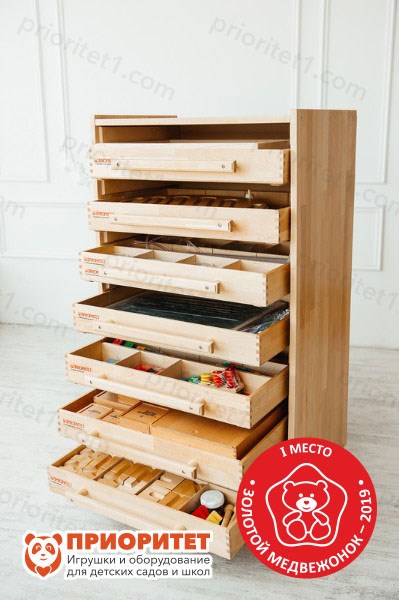 Все игрушки сделаны из натурального дерева. Занятия по этой методике стимулируют логическое мышление, умение сравнивать, анализировать. Ребенок учится считать, знакомится с геометрическими формами. Небольшие детали улучшают моторику пальцев, конструирование развивает воображение и интеллект.