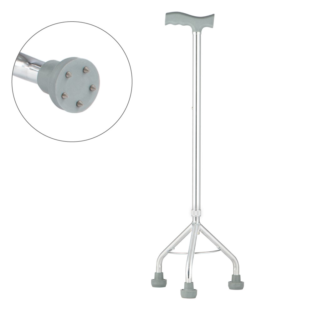 Трость оснащена тремя ножками с устройством противоскольжения и съемными нескользящими насадками, обеспечивающими безопасность и повышенную устойчивость пользователя на скользких поверхностях. Т-образная рукоятка удобно вкладывается руку, обеспечивая комфорт при передвижении. Основа трости телескопическая, подстраивается под рост пользователя легким нажатием на кнопочный замок, уменьшая нагрузку на суставы.