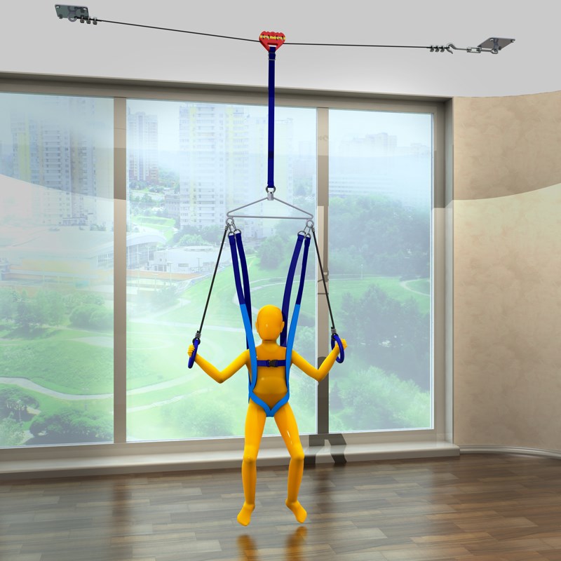 Базовый вариант, благодаря регулировке, подходит для детей до 10 лет. Возможно изготовление индивидуальной системы для детей старше 10 лет и взрослых. Позволяет снимать нагрузку с опорно-двигательного аппарата, обеспечивает страховку, помогает справиться с психологическими ограничениями после длительного постельного режима, тренирует пространственную ориентацию. Тренажер позволяет обучать человека произвольным движениям и статике, а также решать частичные задачи: