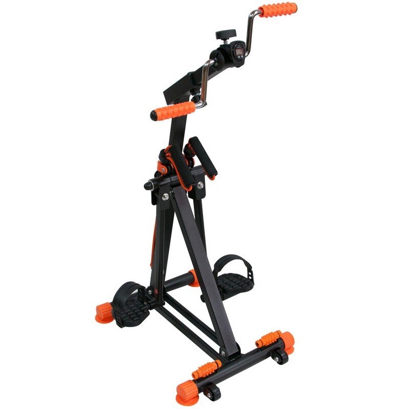 Велотренажер предназначен для разработки ног или рук пациентов в период реабилитации или для инвалидов. Позволяет тренироваться ежедневно в том объеме, который требуется для поддержания формы. Тренирует ослабленные мышцы, улучшает кровообращение в конечностях. Педали нижнего блока предназначены для упражнений на разведение ног в стороны, вперед — назад (не вращаются). Педали верхнего блока вращаются по оси в двух направлениях. Тренажер оснащен регулировкой прилагаемого усилия на педали верхнего блока. Мультифункциональный дисплей отображает количество потраченных калорий, время тренировки и обороты педалей в минуту.